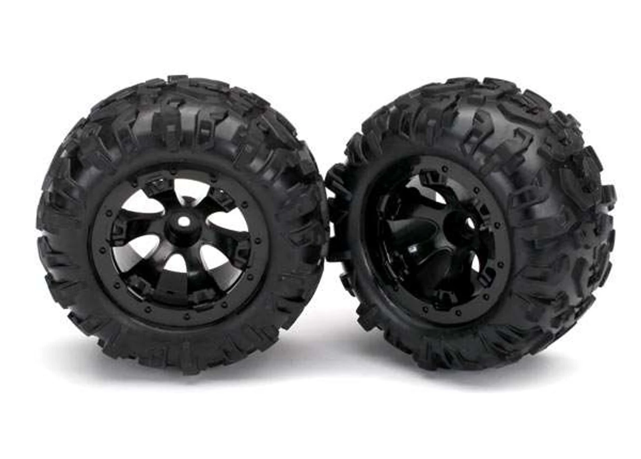 This is a pair of Traxxas 1/16 Geode Black Beadlock-Look Wheels with Canyon AT Tires. This pair comes with the tires pre-glued to the rims with foam inserts installed. The wheels have a 12mm hex.