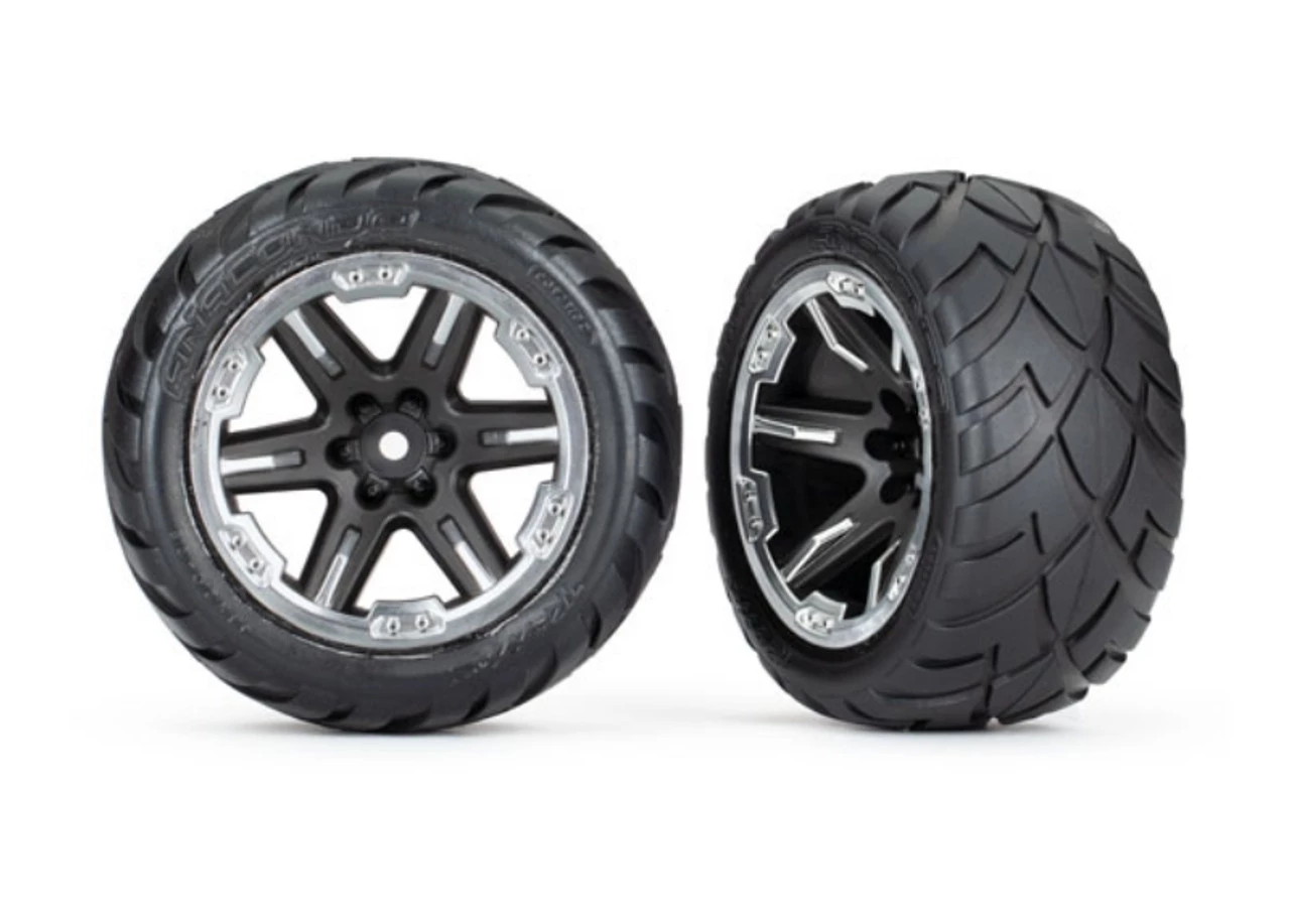 These are the Traxxas 2.8″ Anaconda Wheels, Assembled, RXT Black/Chrome (4WD F/R, 2WD F) (2)