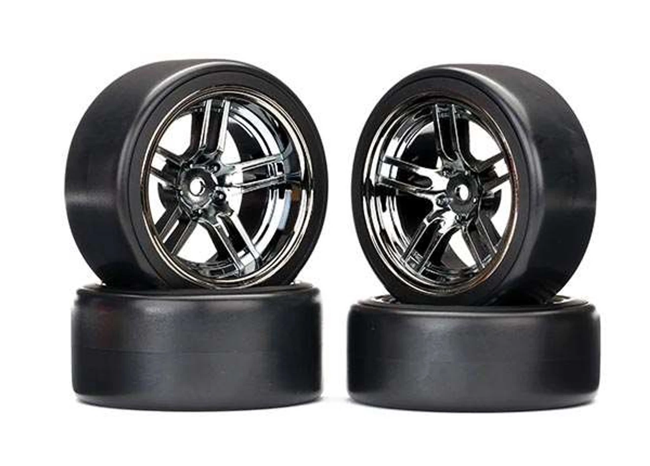 This is a full set of Traxxas 4-Tec 2.0 Front and Rear Drift Tires Pre-Mounted on Split-Spoke Black Chrome Wheels. These drift tires will open up your 4-Tec 2.0 to a whole new R/C world. Test your skills and expand your hobby with a set of these genuine Traxxas aftermarket tires for a perfect fit and excellent performance!