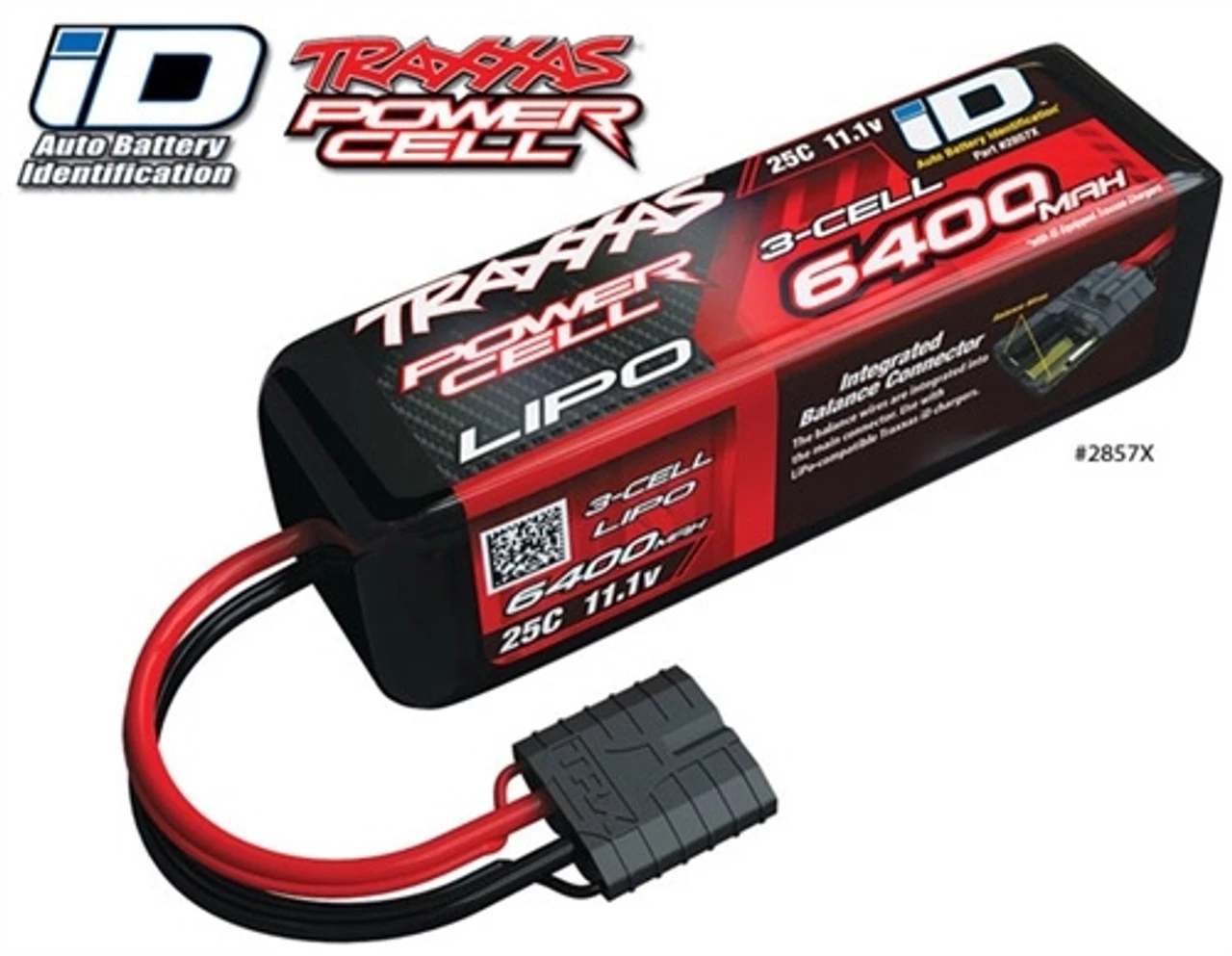 This is the Traxxas Power Cell 11.1V 6400mAh 25C 3S iD LiPo Battery with iD Connector. Traxxas 6400mAh 3S Power Cell LiPo packs are ideal for Rustler VXL, Stampede VXL, Stampede 4×4 VXL, and Bandit brushless VXL models, as well as Spartan boats. Some models may require expansion kits to fit this battery.