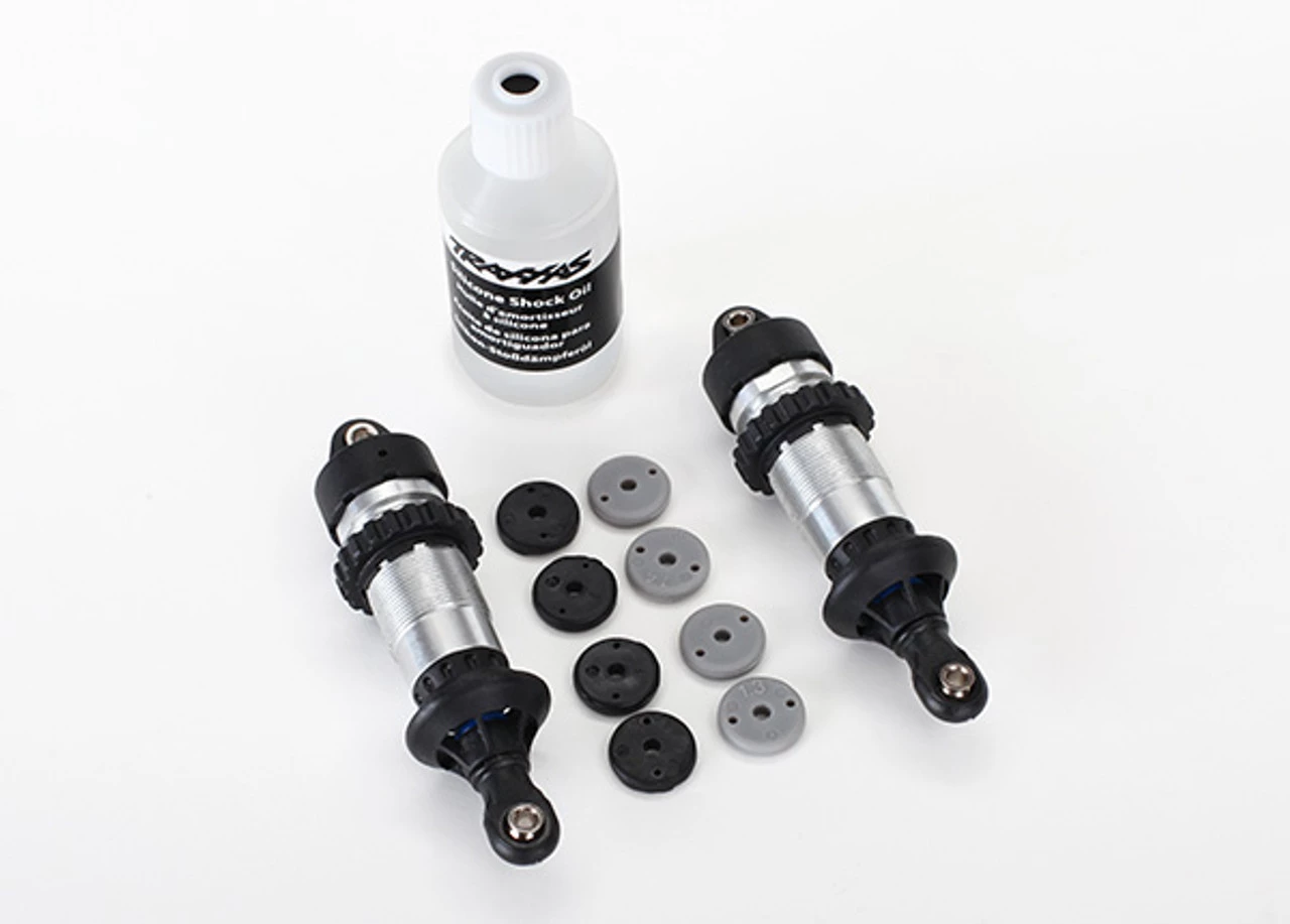 This is a pair of Traxxas Assembled GTR Shocks with Shock Oil for the Revo 2.5, 3.3, Slayer, Slayer Pro, Jato, and XO-1 vehicles. Springs are not included. These come fully assembled as shown, and you just need to put your stock springs on these, or we have the complete line of springs available.