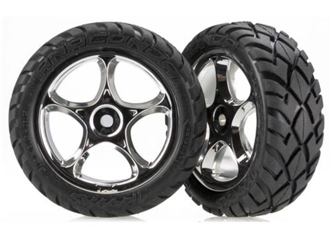 This is a pair of Traxxas Front Anaconda Street Tires Pre-Mounted on Tracer Chrome Wheels for used on the Bandit XL-5 and VXL buggies. The wheels have a slotted hub on the back to slide over the pin on the axles.