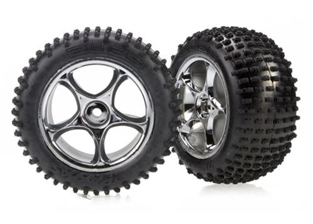 This is a pair of Traxxas Bandit Rear Alias 2.2″ Tires Mounted on Tracer Chrome Wheels. These are a soft-compound tire with foam inserts, pre-mounted and glued on chrome wheels.