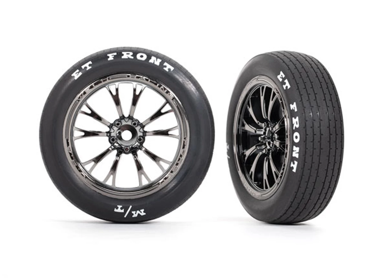 These are the Traxxas Drag Slash Front Wheels, Assembled, Weld Black Chrome (2)