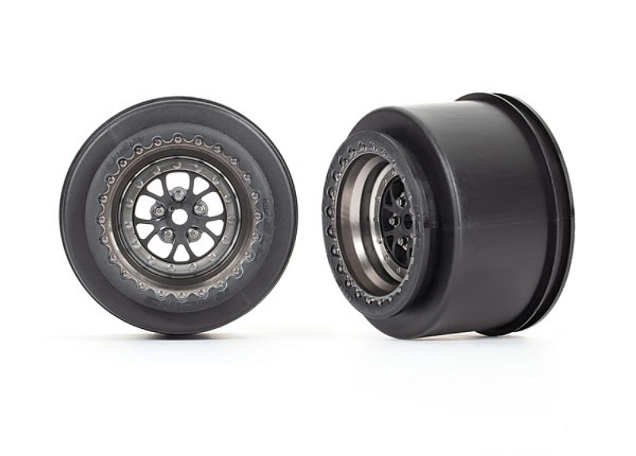 These are the Traxxas Drag Slash Rear Wheels, Weld Satin Black Chrome (2)