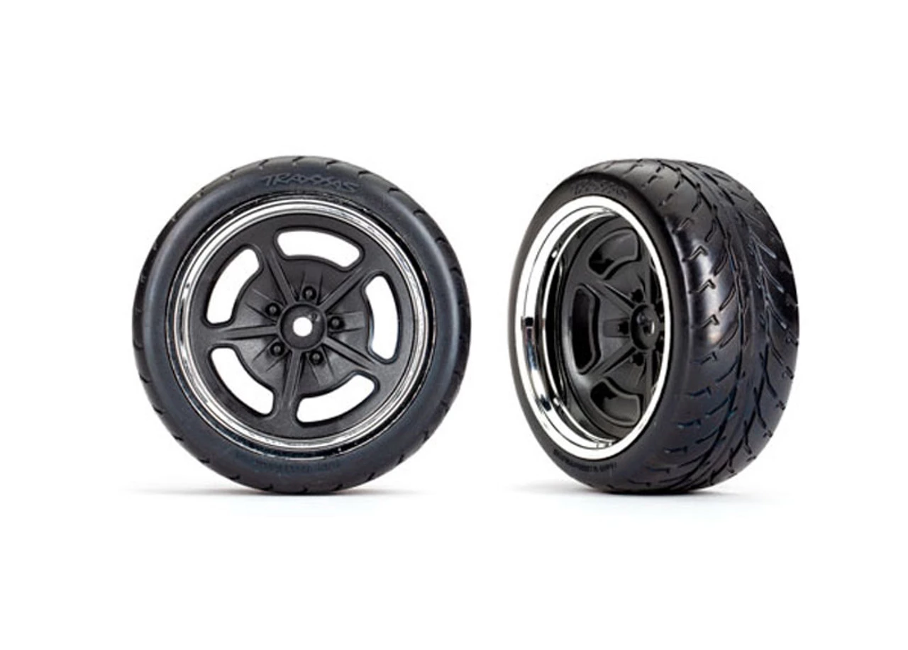 This is a pair of Traxxas Rear Extra Wide 2.1″ Response tires on Black with Chrome Wheels