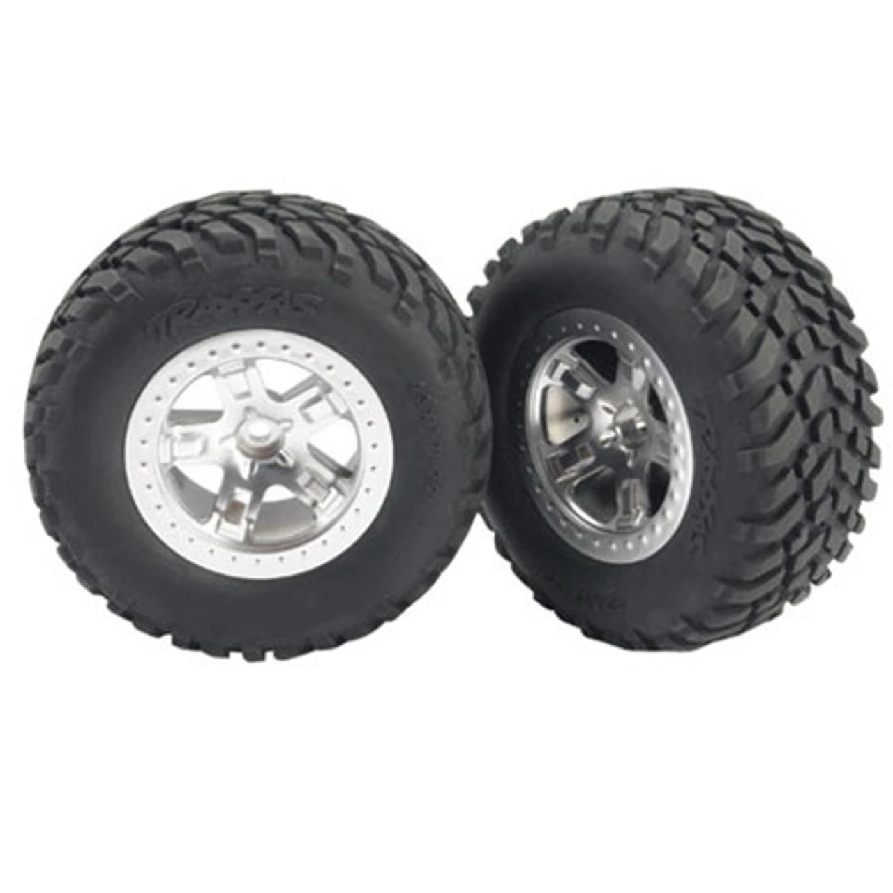 These are a set of 2.2″ Mounted Satin Chrome Wheels and Tires for the Traxxas Slash, TRAC43**.