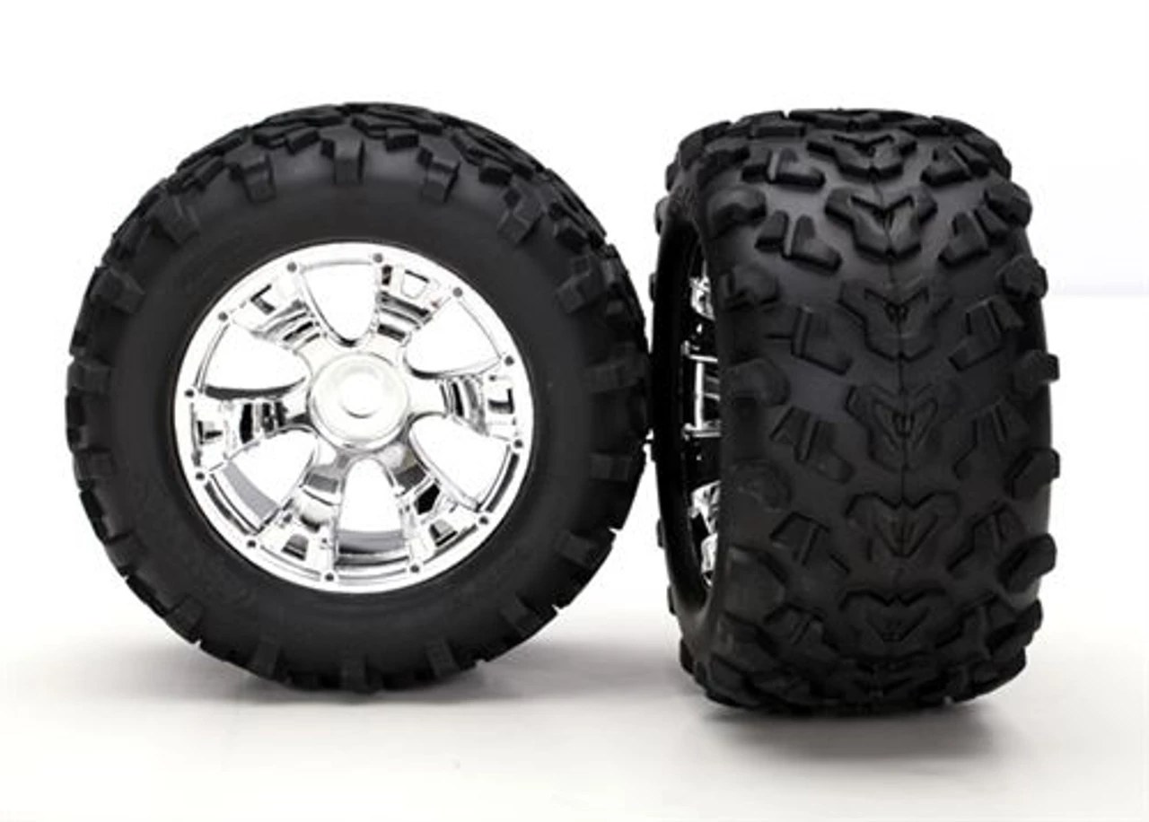 This is a pair of Traxxas Maxx 6.3″ Tires Pre-Mounted on Geode Chrome Wheels with a 17mm Splined Hex.