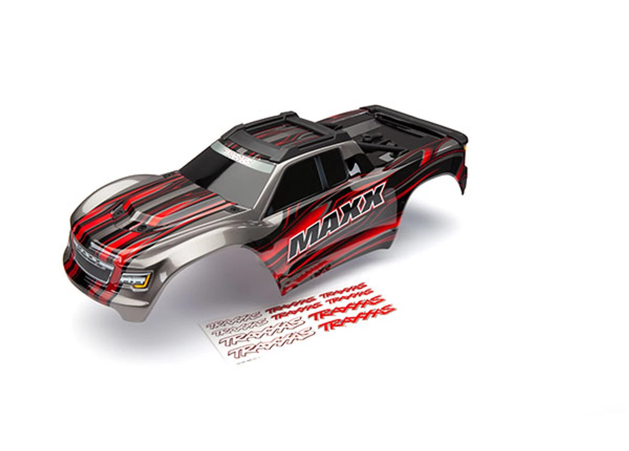 This is the Traxxas 1/10 Maxx Red Pre-Painted Body with decal sheet. The body is fully-painted, trimmed, and has all body accessories including the roof skid plate and quick-release body mount set.