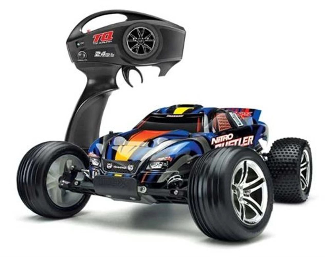 This is the Traxxas Nitro Rustler 2.5 Ready-to-Run Stadium Truck with the TQ 2.4GHz Radio System. This comes with the TRX 2.5 racing engine, capable of pushing this truck to 50+MPH right out of the box! It also comes with the Traxxas TQ 2.4GHz Pistol Grip Radio, On-Board Push Button EZ Start System (battery and charger included!), and a pre-painted body.