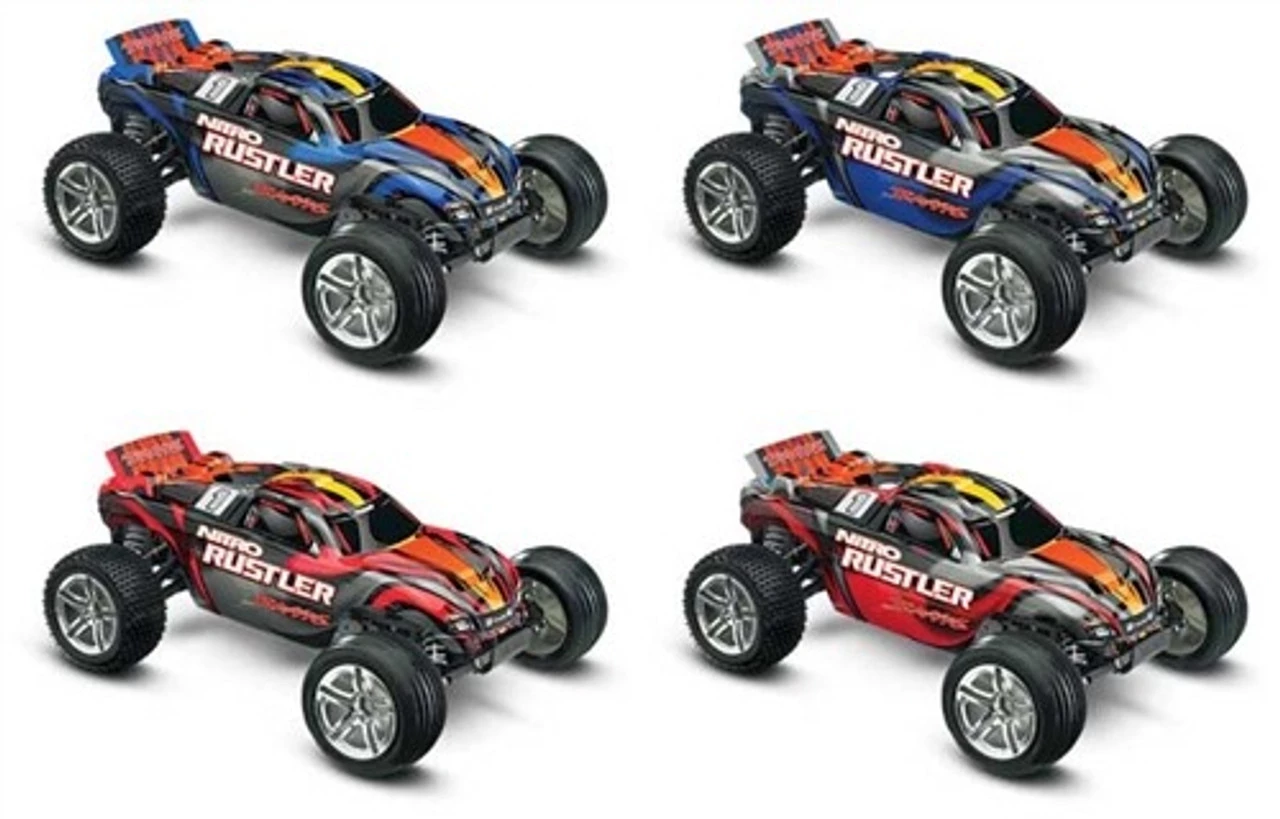 The Nitro Rustler is the first name in high performance 2WD nitro stadium trucks. Powered by the proven performance of the TRX 2.5 Racing Engine, Nitro Rustler totally out-muscles the competition with top speeds beyond 50 mph! The TRX 2.5 also pumps out the torque for brutal, wheel-standing launches and absolutely ruthless acceleration. The all-new body design cheats the wind with its smooth curves and low-slung stance, while the outrageous new graphics dominate with style. The separate wing securely bolts to the new body with precise aluminum hex hardware. Chrome 2.8 Twin Spoke rims are wrapped with pre-glued Alias step-pin tires in the rear and Alias ribbed tires up front. The high-tech rubber compound ensures great grip on a variety of surfaces. New grey-molded composite parts are thoughtfully integrated to enhance the look of the chassis. Fast, light, and loaded with power, Nitro Rustler’s power-sliding, dirt roosting attitude will have you reaching for the throttle again and again.