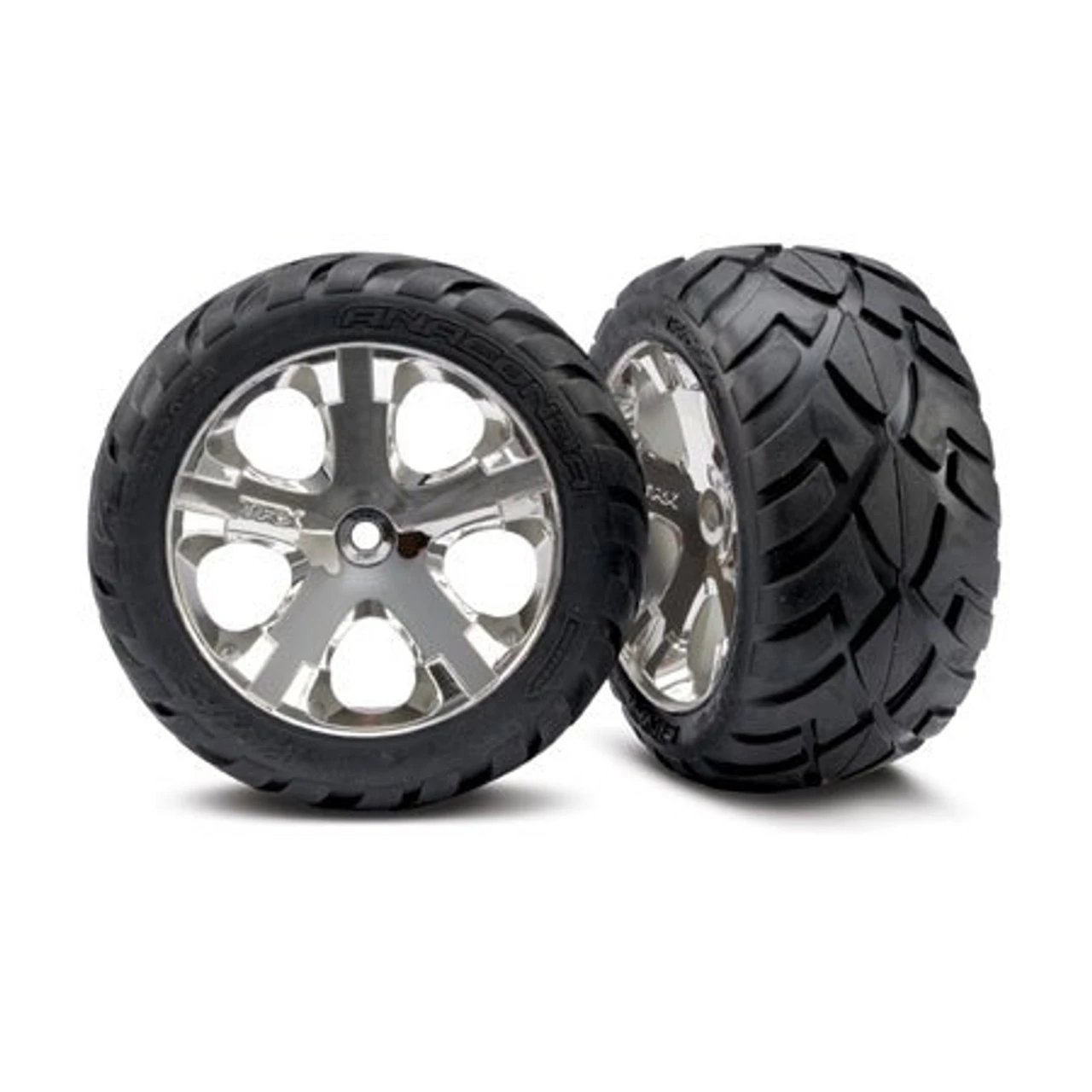 This is a pair of the Traxxas Chrome Rear All Star Wheels with pre-mounted Anaconda Tires. These are perfect for the rear of the Stampede, Rustler, and other electric vehicles.