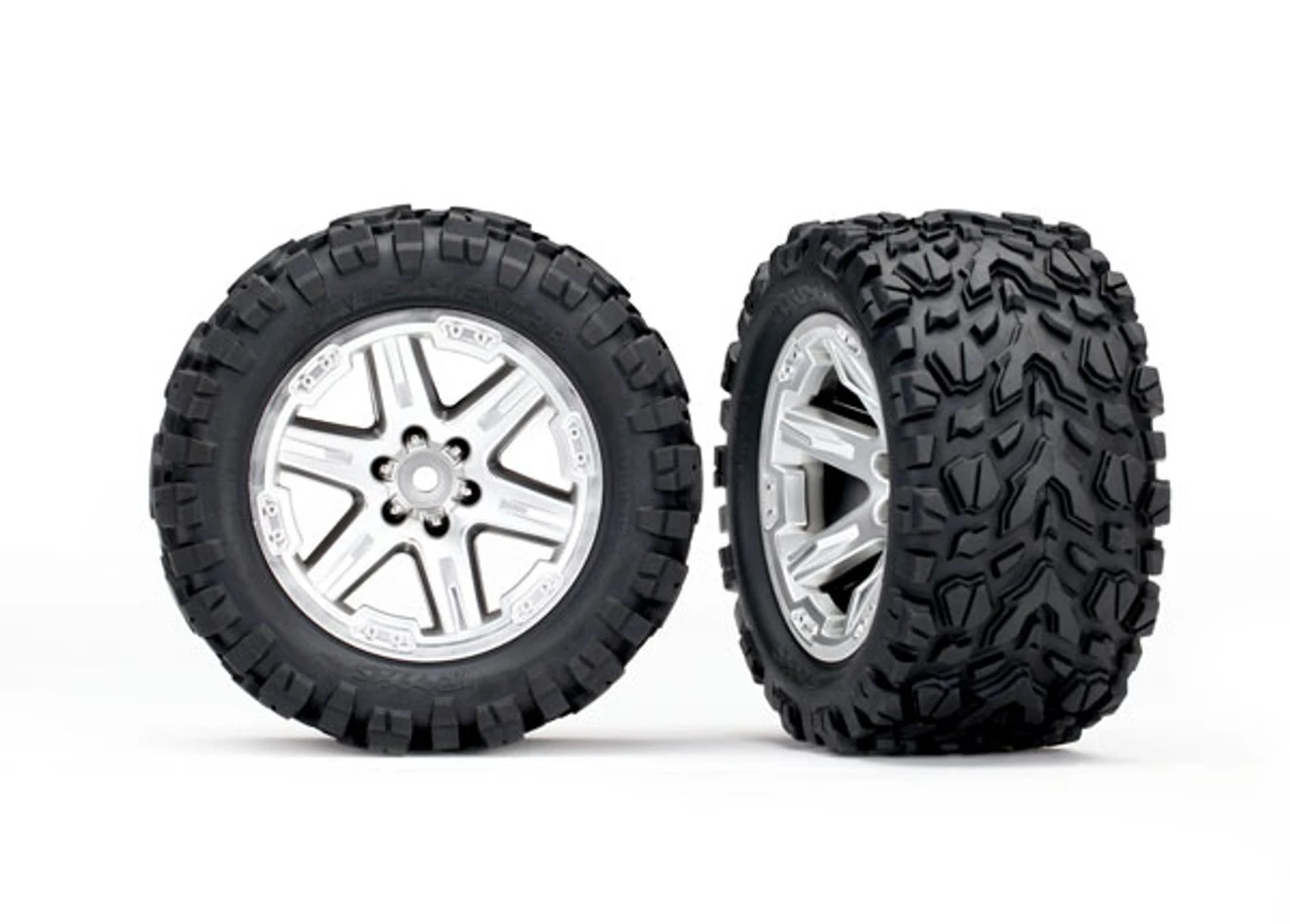 These are the Traxxas Rustler 4×4 Talon Extreme Tires on Satin Chrome Wheels with 12mm Hex for 4×4 Front/Rear and electric 2WD Front. In addition to the Rustler 4×4, these can be used with Stampede 4×4, Slash 4×4 (with body modification), and others