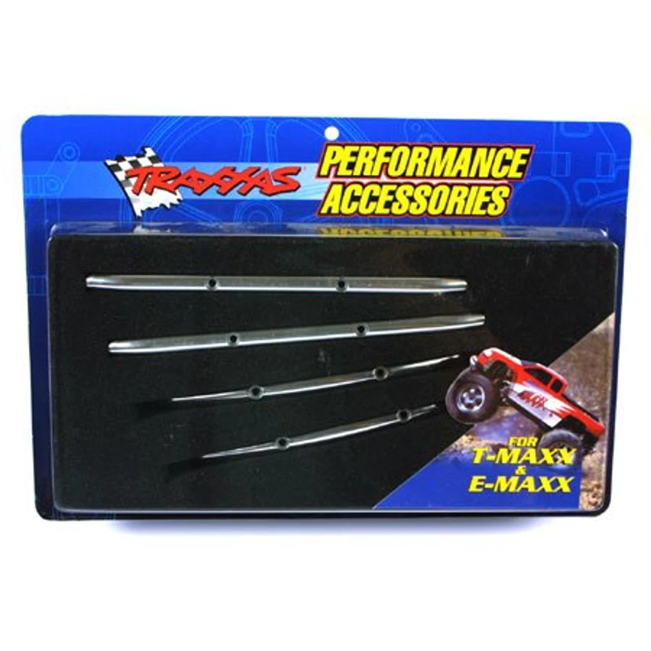This is a set of Traxxas 6061 T-6 Aluminum Front and Rear Bumpers for the Traxxas T-Maxx and E-Maxx trucks. These will fit all versions of the T-Maxx .15, 2.5, 3.3, E-Maxx, E-Maxx 16.8V, and E-Maxx Brushless trucks. These bumpers attach to the bumper mounts at the front & rear of the chassis.