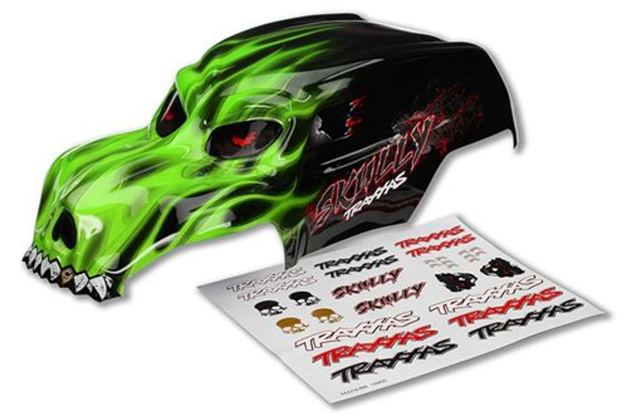This is the Traxxas Skully Green Heavy Duty Pre-Painted Body with Decals. This can be used on the Traxxas Skully and other electric Stampede trucks (may require extended body mounts).