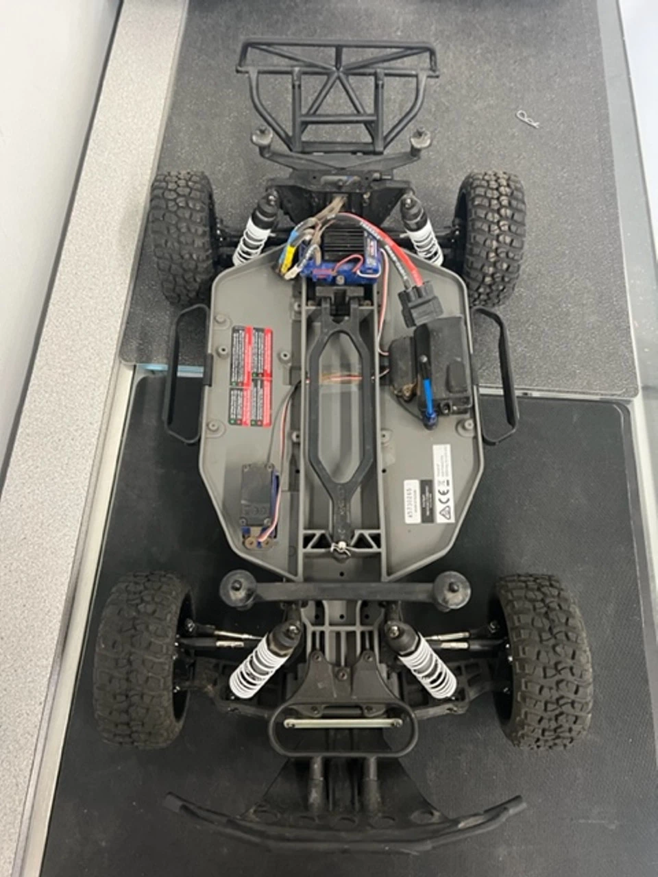 - Speed control, receiver, and steering servo are securely fastened to chassis