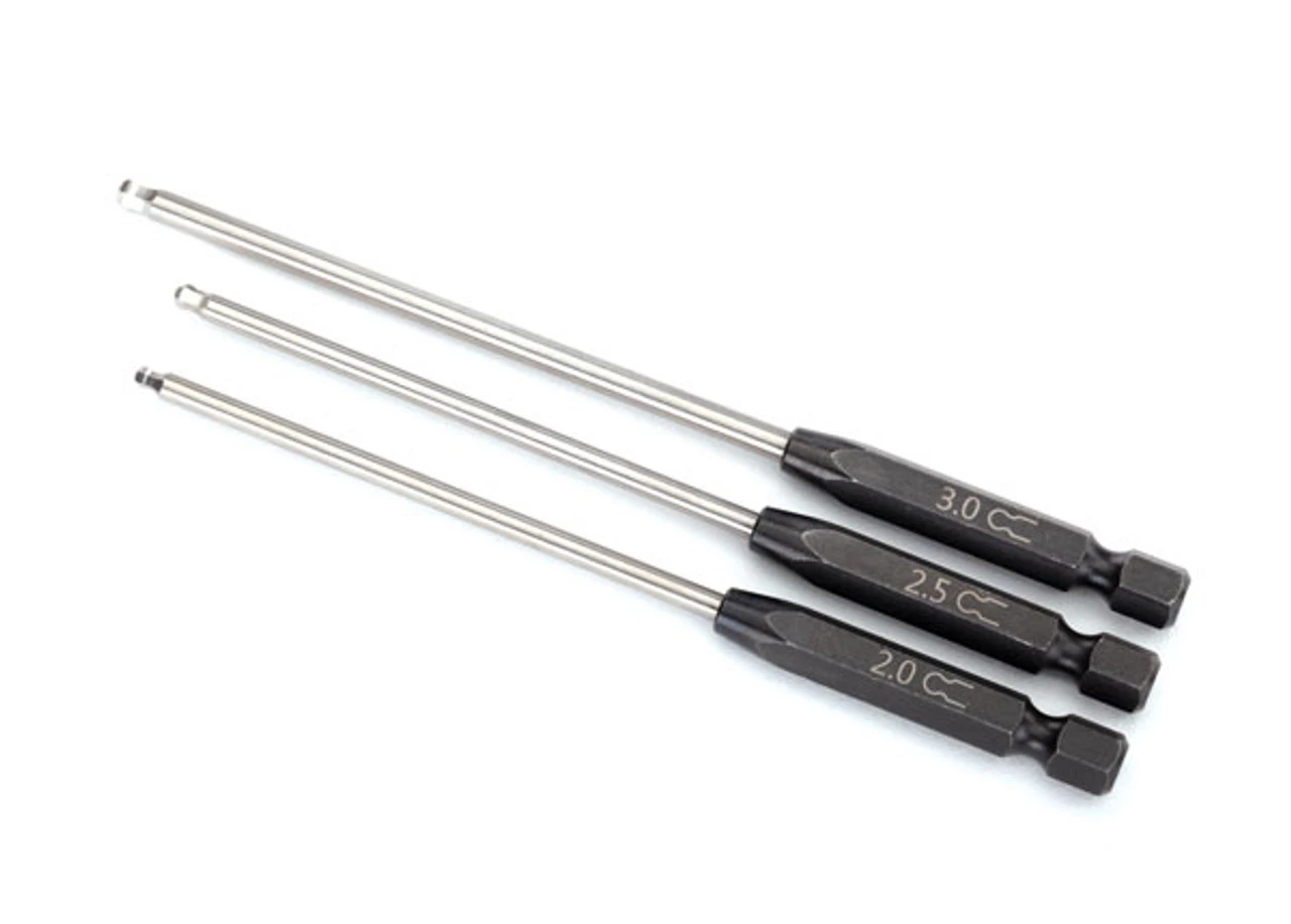 This is the Traxxas Speed Bit 3-Piece Metric Ball Hex Driver Set with 1/4″ drive. This set includes 2.0mm, 2.5mm, and 3.0mm ball end bits. The 1/4″ drive makes these perfect for use with powered screwdrivers, or with the standard Traxxas Speed Bit handles.