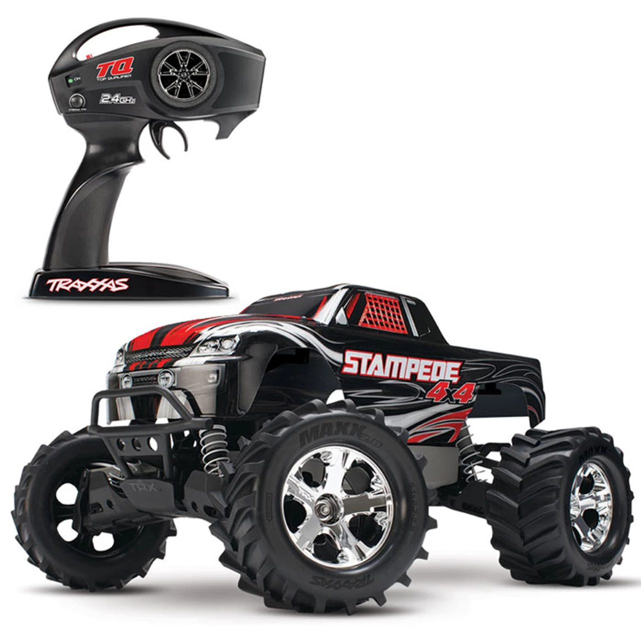Stampede 4X4 is equipped with the new TQ 2.4GHz radio system. The TQ’s modern design features an internal antenna for a sleek look, and an ergonomic grip for all-day driving comfort. 2.4GHz technology means there’s no need to worry about frequency conflicts, no matter how many other drivers you’re racing with. Just switch on and drive — the TQ automatically locates and locks onto an open frequency.