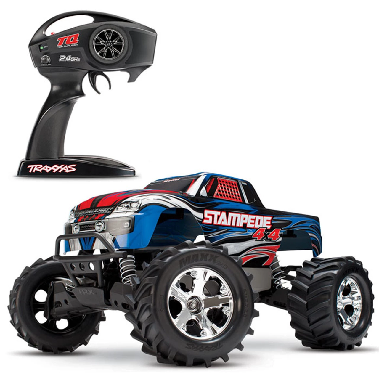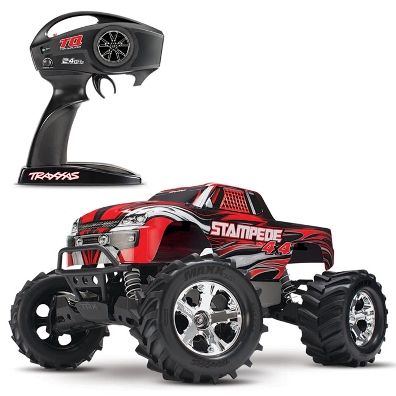 Whether you’re going through muddy water crossings or just having fun crushing your buddies’ cars, the Stampede 4X4 just doesn’t know when to quit. The Stampede 4X4 is overbuilt and Traxxas Tough to withstand all the 4-wheel drive monster mayhem you can dish out. Its tall, drive-over-anything ground clearance and ultra-tough, long-arm suspension make Stampede 4X4 feel nearly indestructible. Chrome All-Star 2.8″ wheels give Stampede 4X4 aggressive style, and soft Chevron Maxx tires deliver true multi-terrain capability. The XL-5 ESC and Titan 550 motor dish out plenty of driving excitement. It’s all waterproof, so the fun keeps going through all kinds of wet conditions! No other truck offers Stampede 4X4’s unique style, capability, and reputation for durability. Stampede 4X4 is perfect for almost any age driver or skill level and comes fully assembled and painted. Just add your battery and charger and it’s time to roll! Speed, style, versatility, and fun