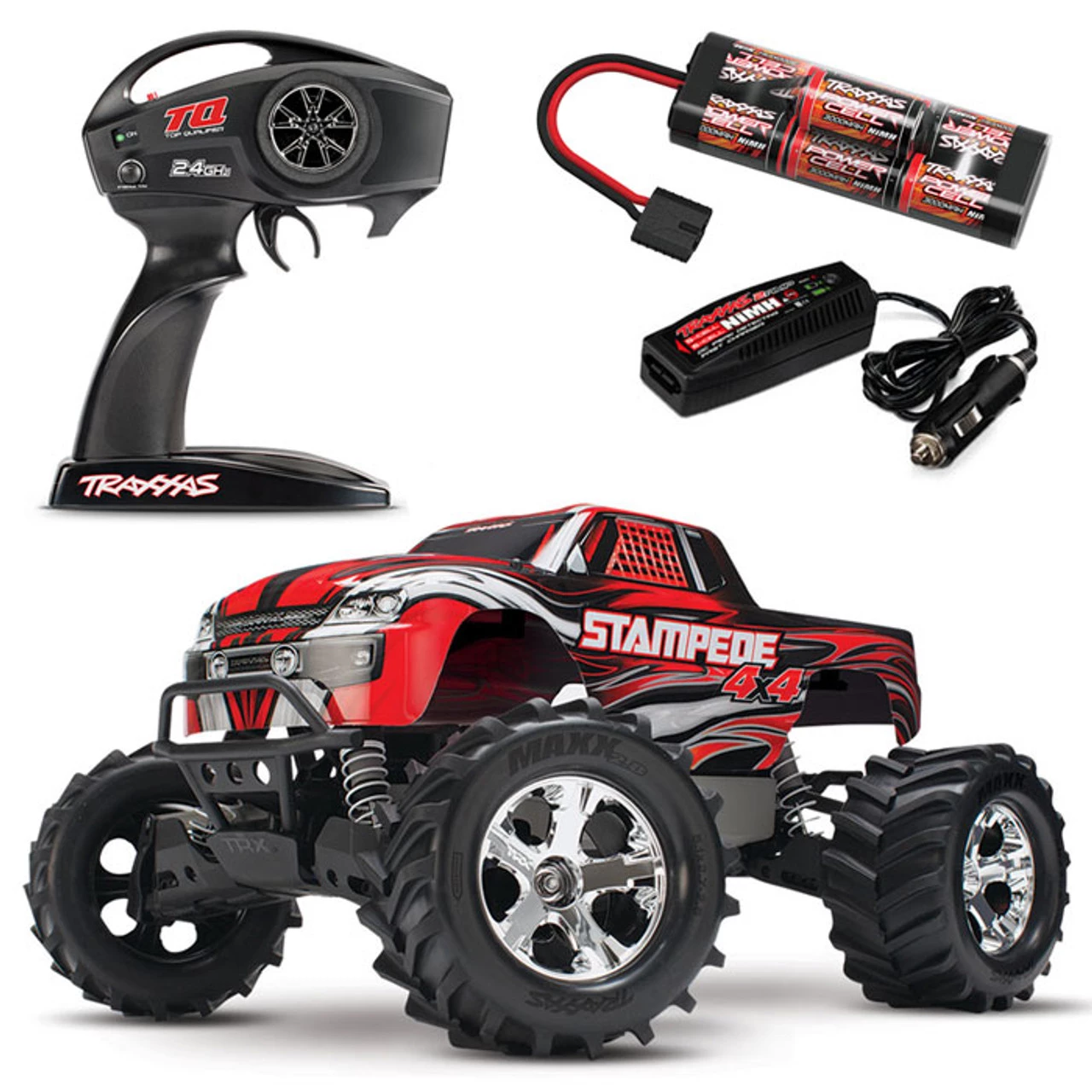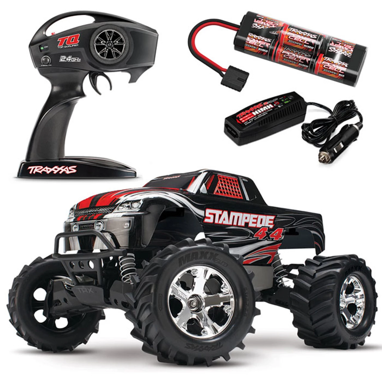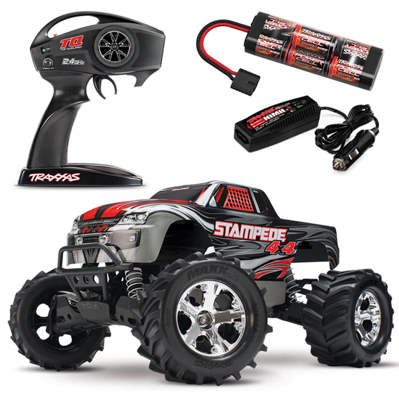This is the Traxxas Stampede 4X4 XL-5 Brushed Electric Ready-to-Run RC Monster Truck with TQ 2.4GHz radio system, 7-Cell 3000mAh Battery Pack with iD connector, and 4-Amp DC Fast Charger. With waterproof electronics and 4-wheel drive, the Stampede 4X4 XL-5 provides fun in all weather conditions, at an affordable price!
