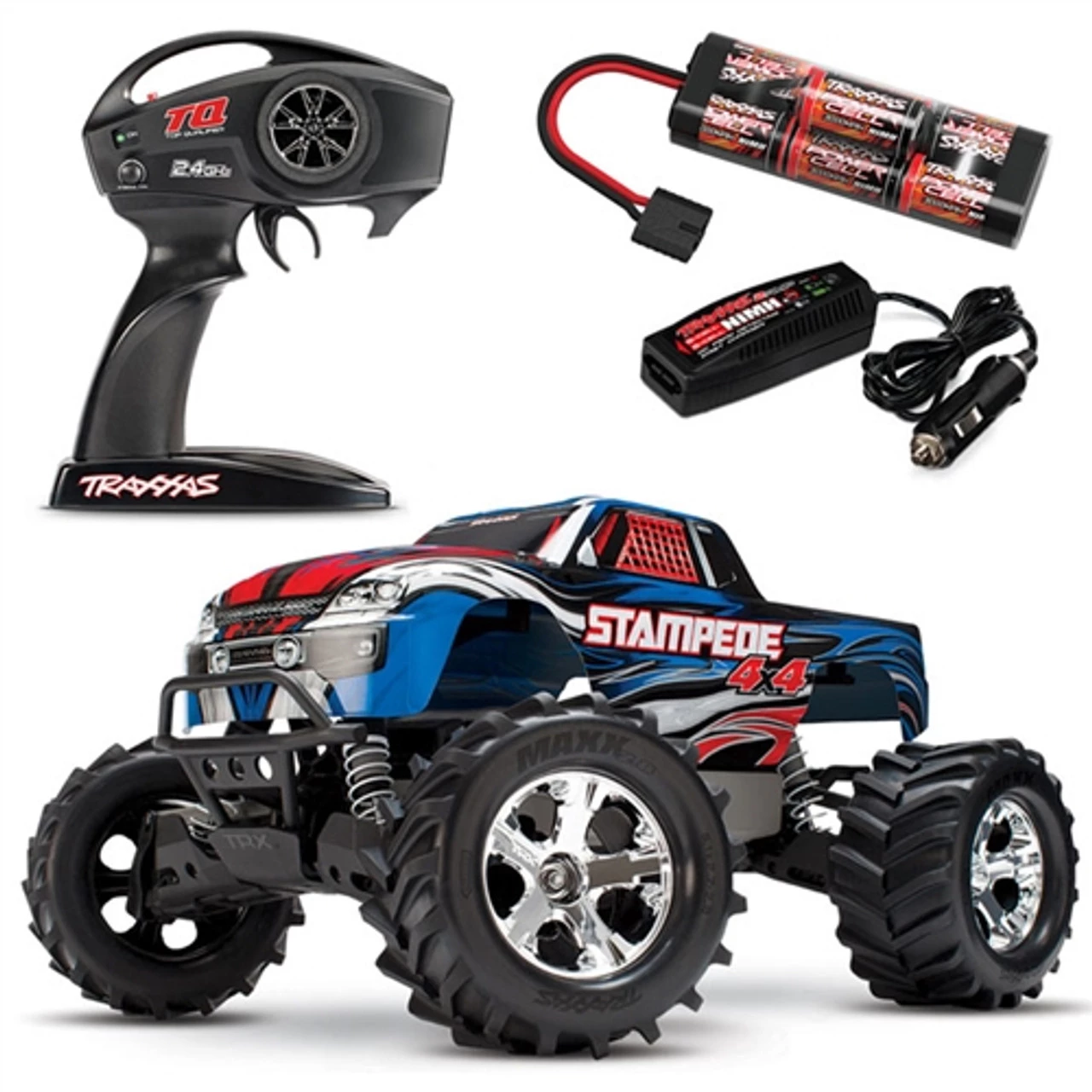 Stampede 4X4 comes fully-assembled and Ready-To-Race with the TQ 2.4GHz radio system, XL-5 electronic speed control, Titan 12T motor, painted and decaled body, pre-glued tires, and detailed instructions. Traxxas backs Stampede 4X4 and all of their products with top-notch support that is second to none. A staff of skilled representatives is on-hand at Traxxas to answer your questions via phone, website, or e-mail. Unmatched parts support allows Stampede 4X4 to be serviced with parts and support from thousands of hobby dealers worldwide. Your investment is also protected by the Traxxas Lifetime Electronics Warranty. Traxxas goes the extra mile to ensure that your R/C experience is easy and fun (and fast!).