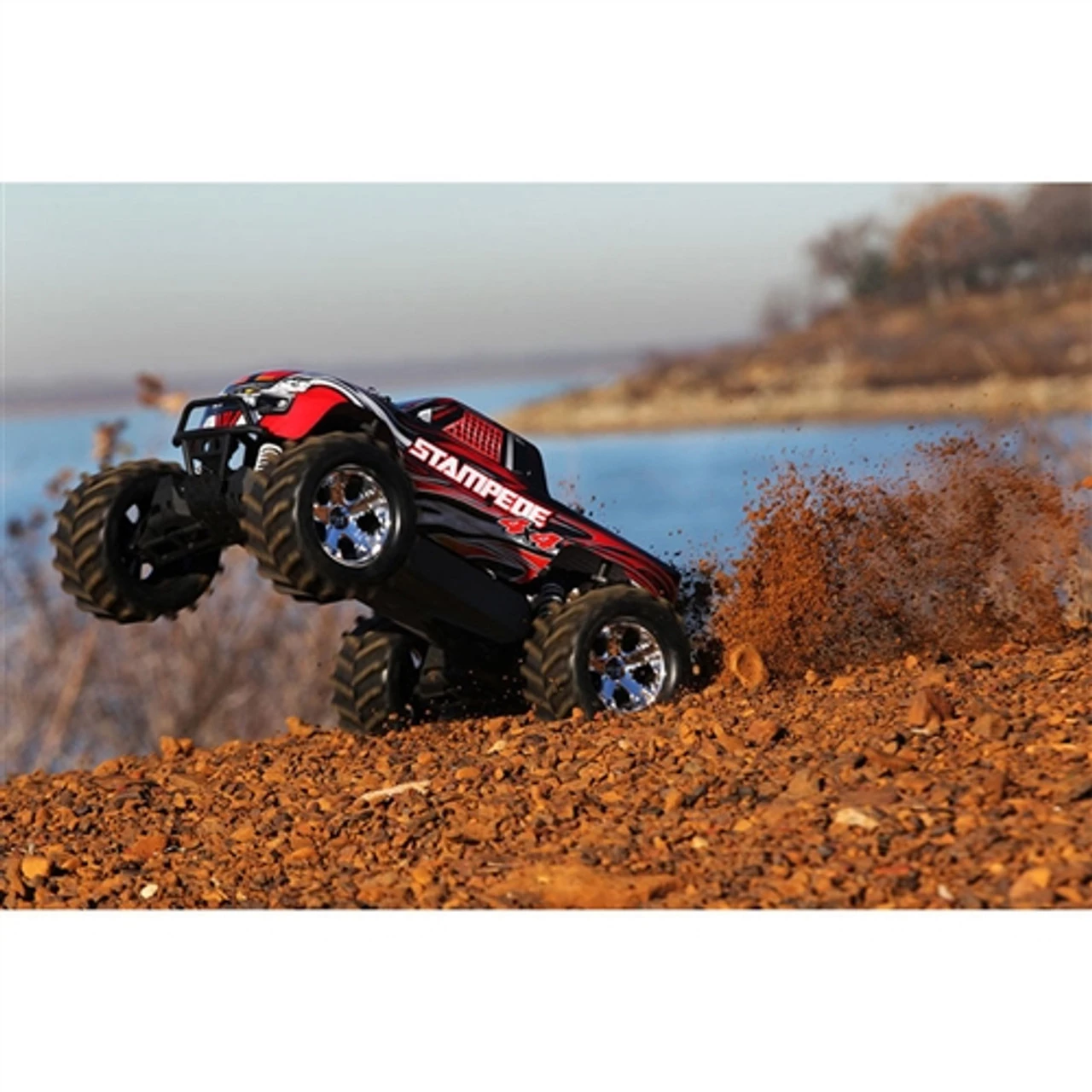 Stampede 4X4 is built on the proven performance of the advanced shaft-driven 4WD system and innovative modular design of the award-winning Slash 4X4. The chassis fully integrates the electronics and battery compartment for an efficient and compact layout, and maintains the high center ground clearance that gives Stampede its monster stance and high-riding look. The extra clearance drastically increases the off-road versatility that allows you to tackle rougher terrain and bigger obstacles. The Stampede 4X4 feels planted and secure at speed, even on pavement and in other high-grip conditions. Stampede 4X4 is 100% monster truck, but it handles like a racing machine!