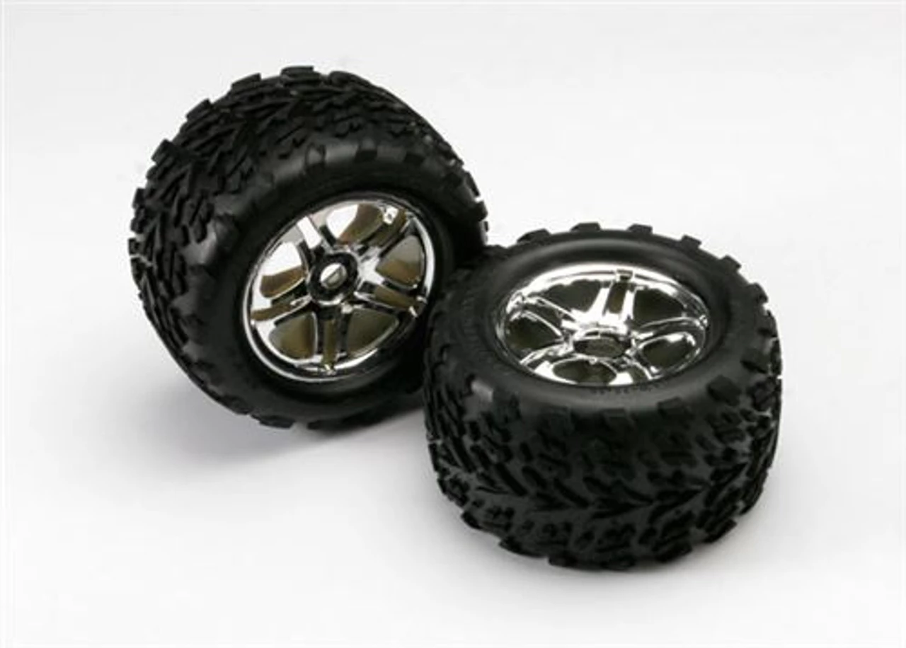 This is a pair of Traxxas Talon Tires with Foam Inserts, Pre-Mounted on 3.8″ Chrome Wheels with 17mm Splined Hex Hubs. These can be used on 1/10 E-Revos, Revo 3.3, E-Maxx, T-Maxx, and Summit trucks using 17mm Splined Hexes.