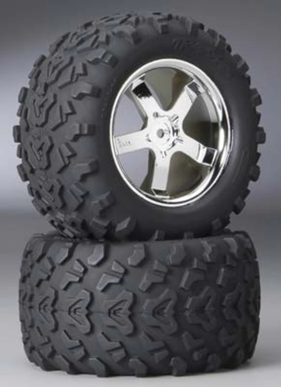 This is a pair of Traxxas 3.8″ Tires and Hurricane Chrome Wheels with 14mm hex for the Traxxas T-Maxx, E-Maxx, and Revo trucks.