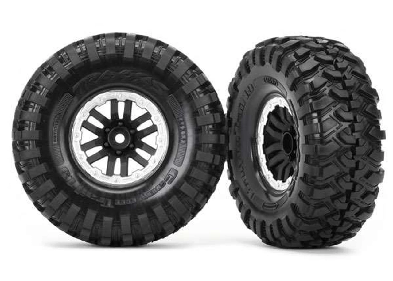 These are the Traxxas Canyon Trail Tires Pre-Mounted on 1.9″ TRX-4 Wheels with a simulated Satin Beadlock Ring. The tires come pre-glued, with foam inserts inside the tires as well. These are sold in pairs.