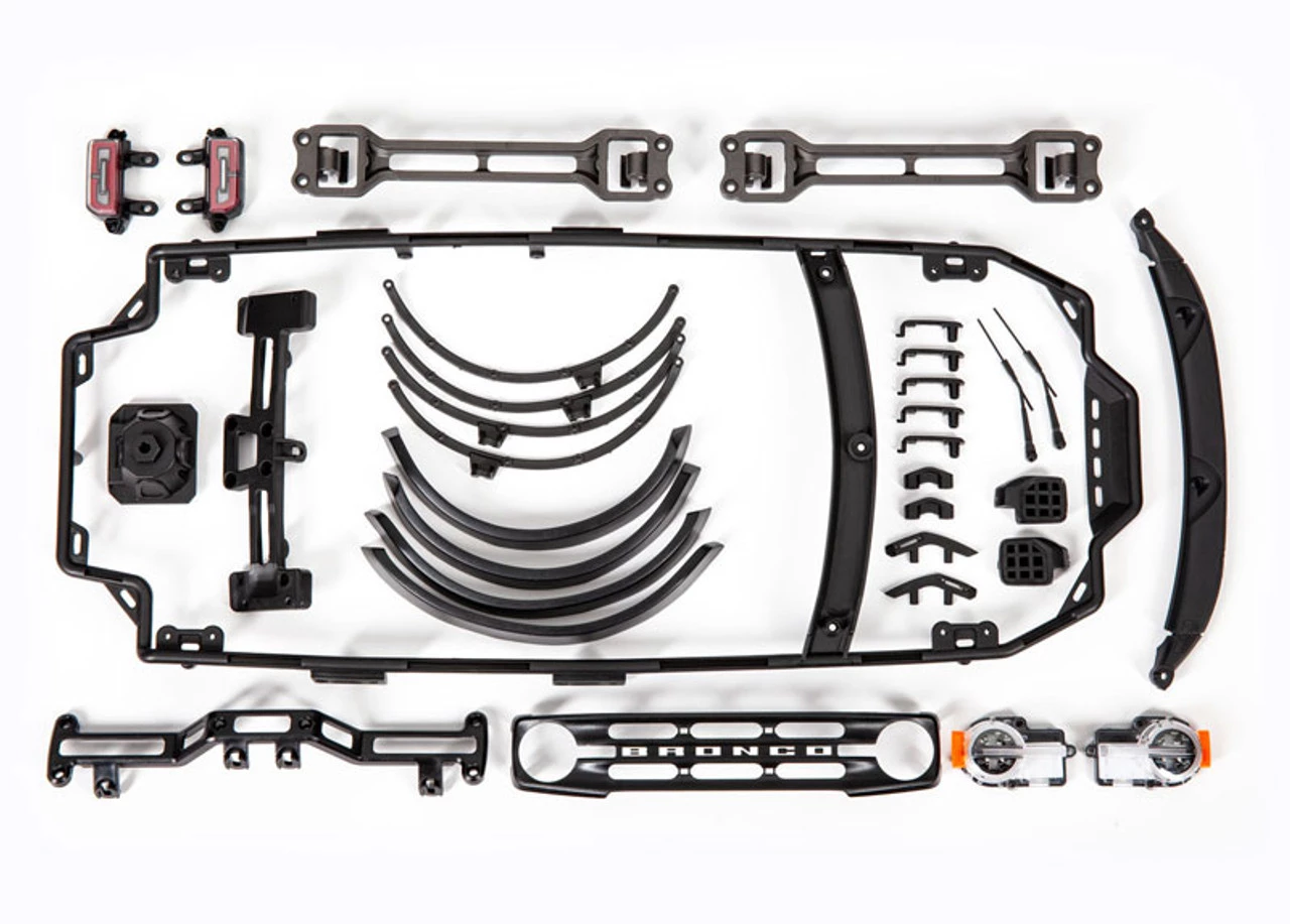 This is the Traxxas TRX-4 2021 Ford Bronco Clear Body. Traxxas clear bodies come fully-trimmed with pre-drilled body holes for easy mounting. There’s also a protective overspray film applied to the body. Window masking, body accessories, and decals also come in the kit. (requires #8080X inner fenders)