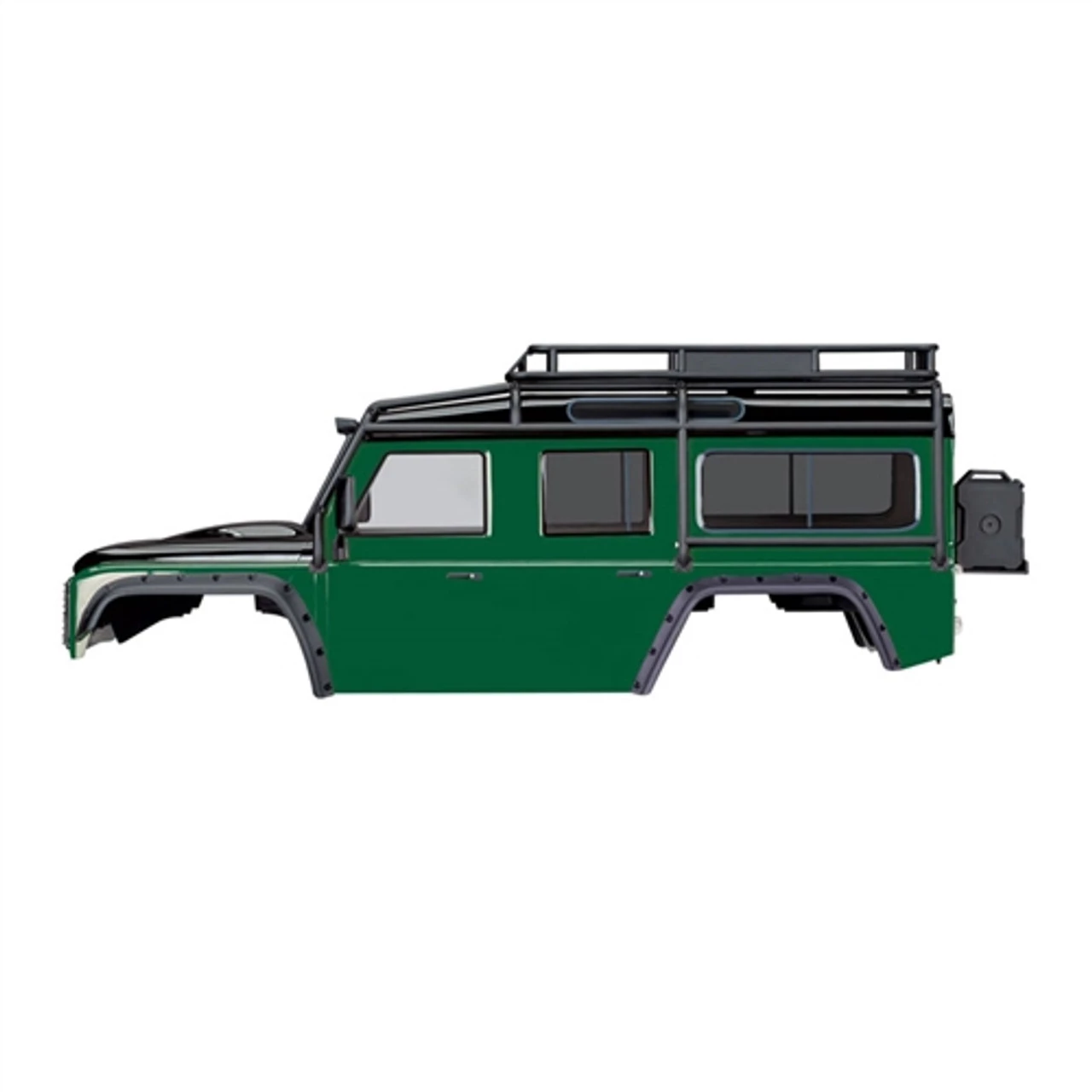 This is the Traxxas TRX-4 Green Land Rover Defender Body, Fully-Assembled and Complete with ExoCage, inner fenders, fuel canisters, and jack. This is designed for TRX-4 trucks running the 324mm / 12.8″ wheelbase setup.