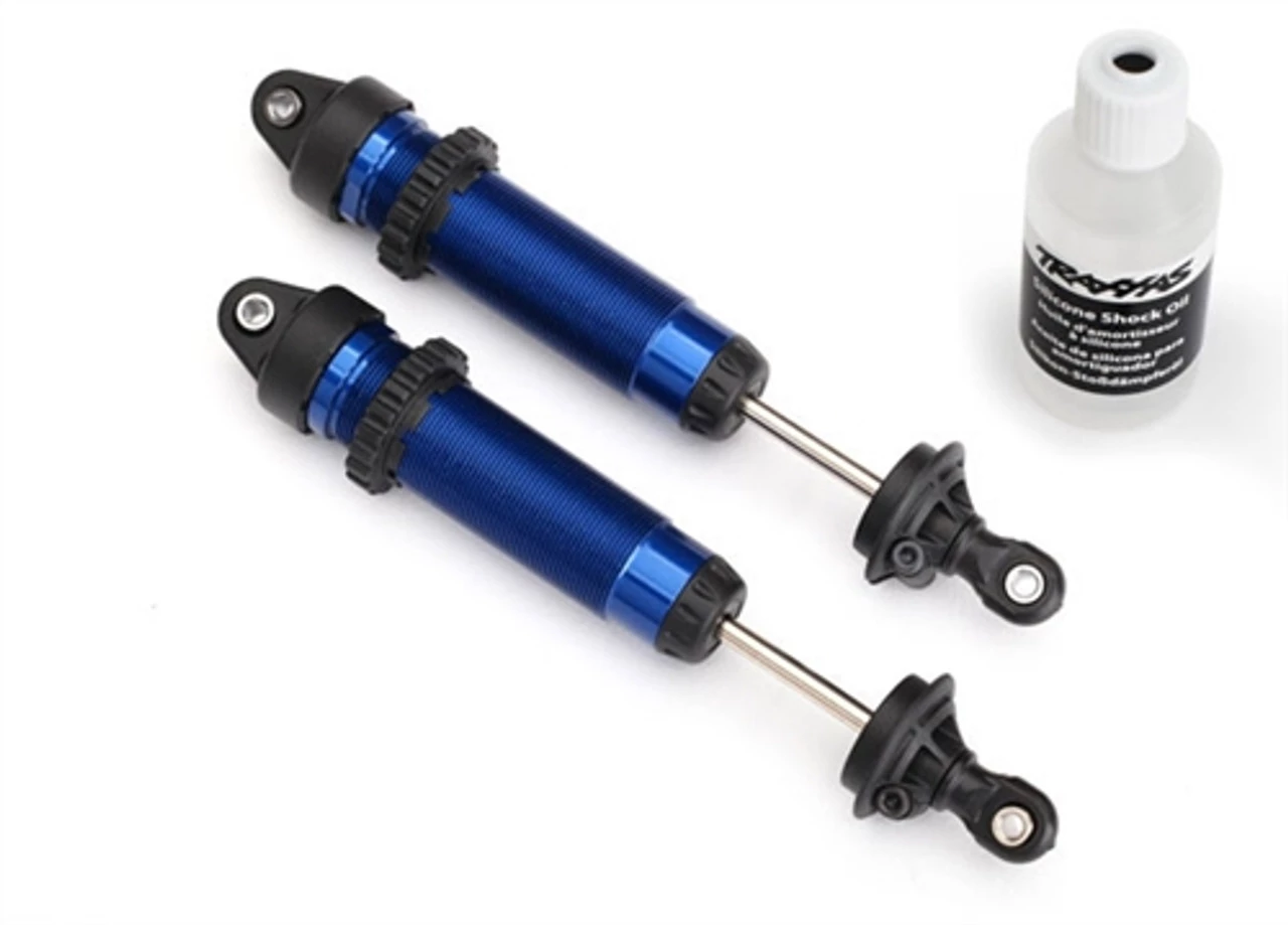 This is a pair of Traxxas Unlimited Desert Racer Blue Aluminum 139mm GTR Assembled Threaded Rear Shocks with Shock Oil.