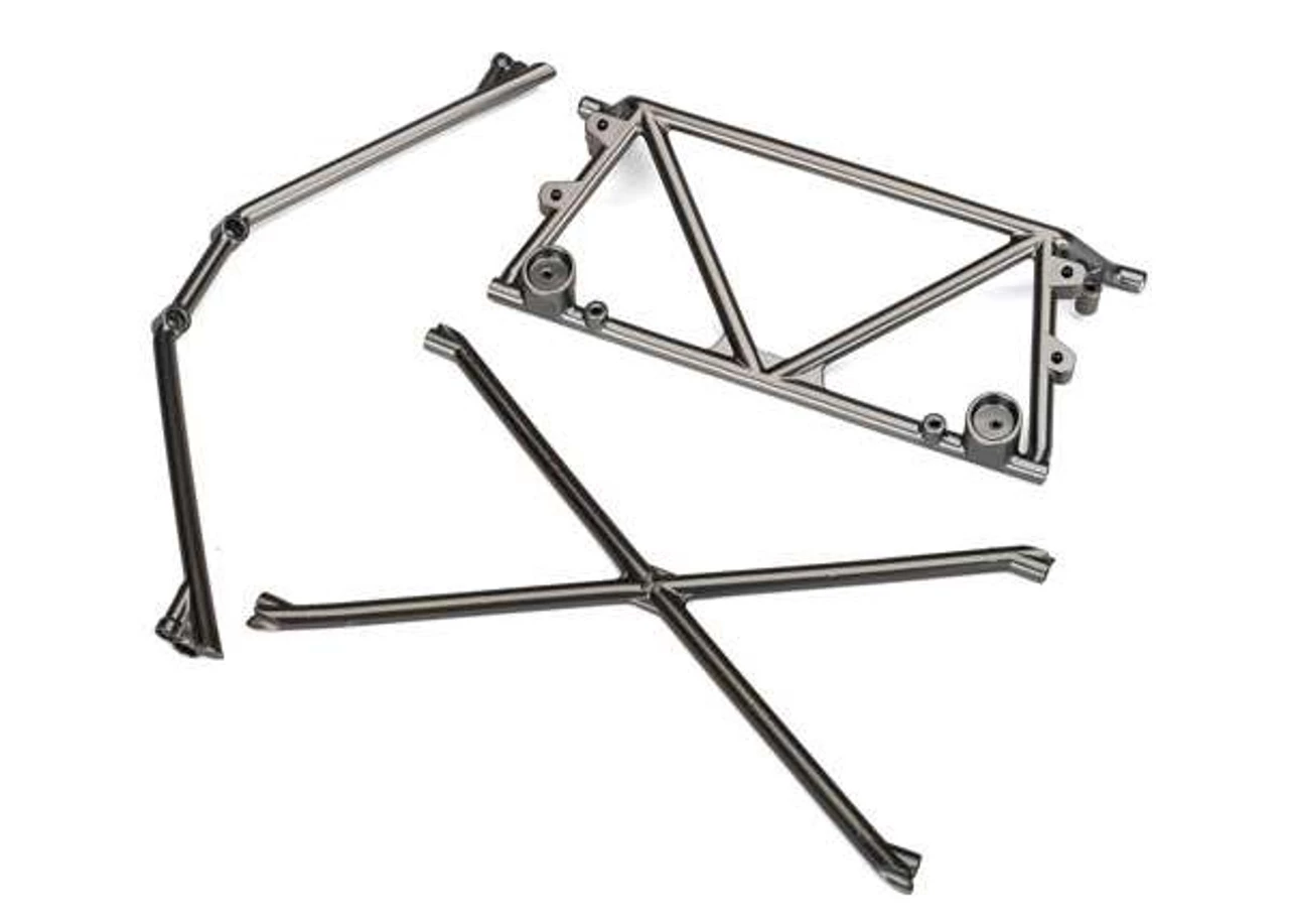 This is the Traxxas Unlimited Desert Racer Satin Black Chrome-Plated Center Support, Cage Top, and Rear Cage Support Tube Chassis Sections. These are direct-fit upgrades to the stock parts, offering a great boost in the appearance of the UDR’s realistic cage.