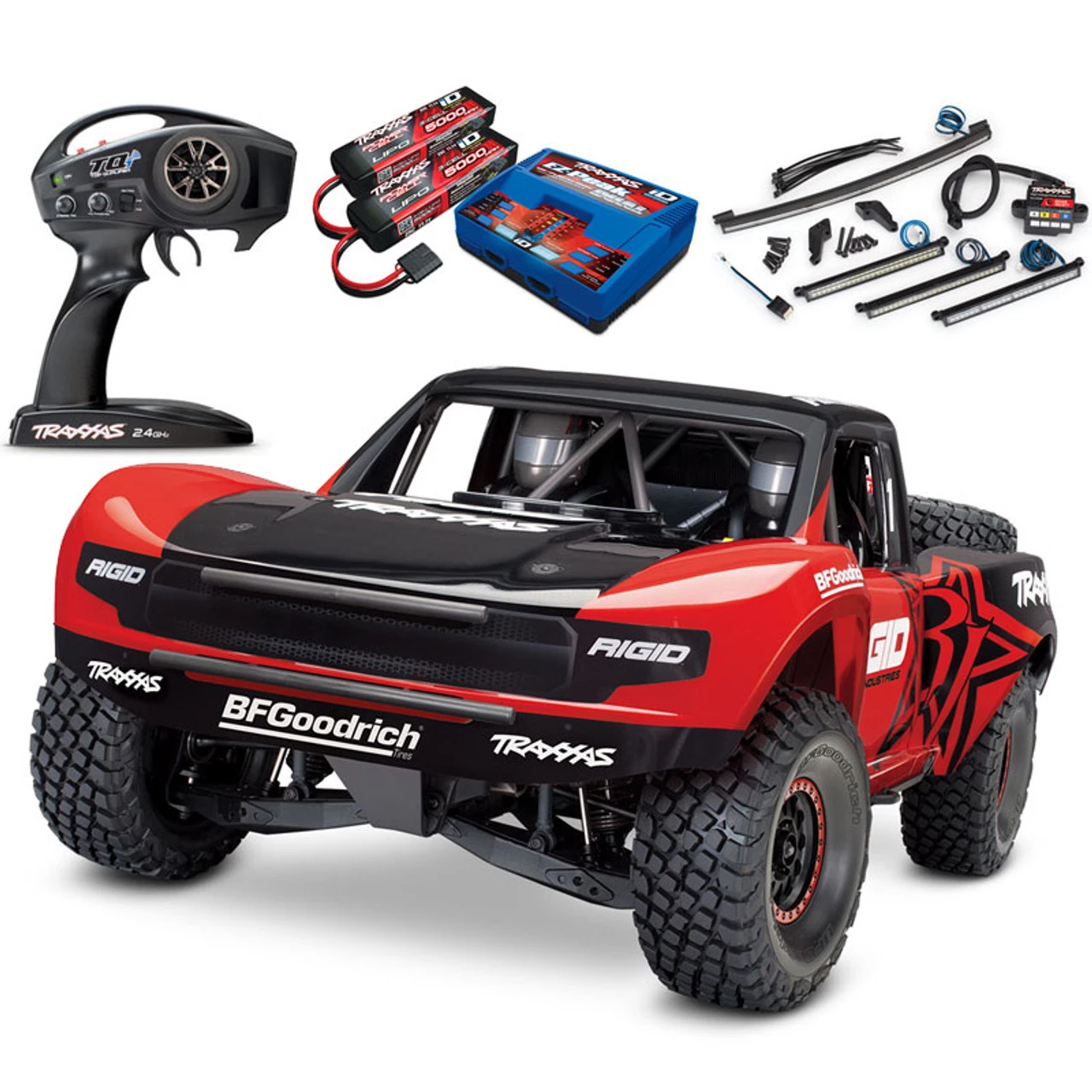 This is the Traxxas Unlimited Desert Racer 4WD Brushless Electric Off-Road Truck COMBO PACKAGE with dual 3S LiPo batteries and Traxxas EZ-Peak Dual ID Charger. This setup is ready for 50+MPH speeds! The truck is fully-equipped with a Velineon VXL-6s Brushless Power System, TQi 2.4GHz radio system, and Traxxas Stability Management (TSM).