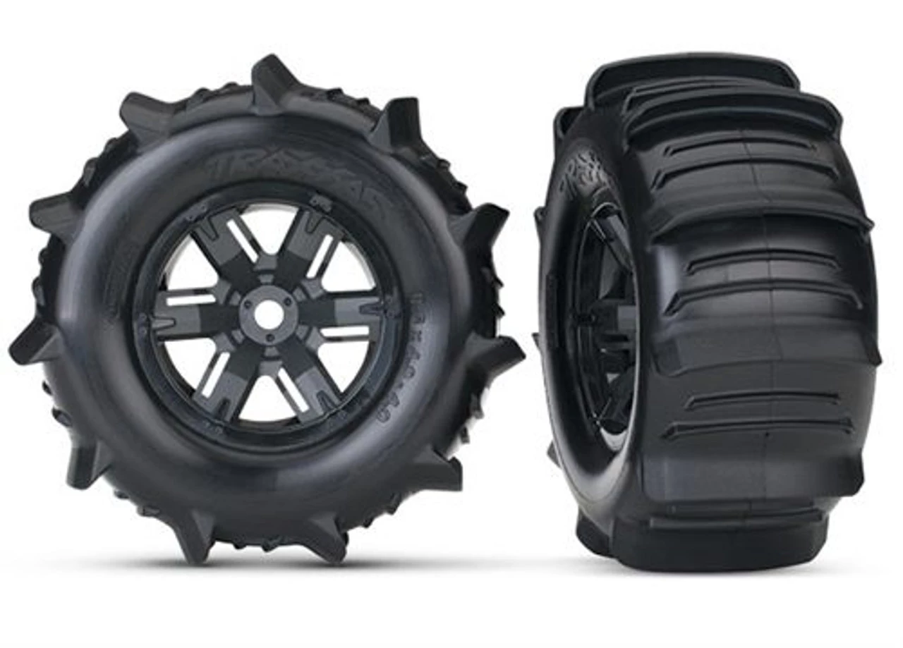This is a pair of Traxxas X-Maxx Paddle Tires on Black Wheels. Add these to your X-Maxx for ripping through the sand dunes, snow, mud or water!