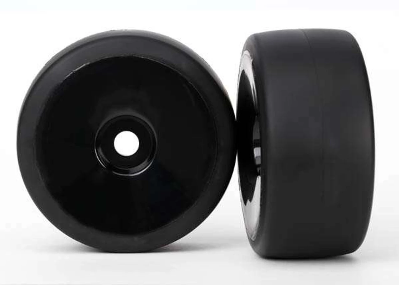 These are the Traxxas XO-1 Rear S1 Slick Tires Pre-Glued on Black Dished Wheels (2).